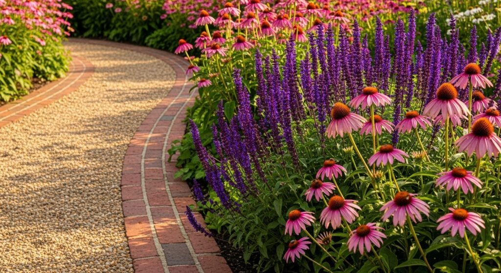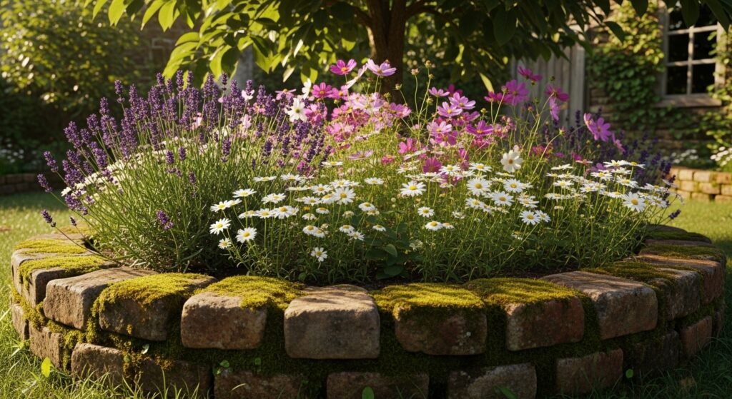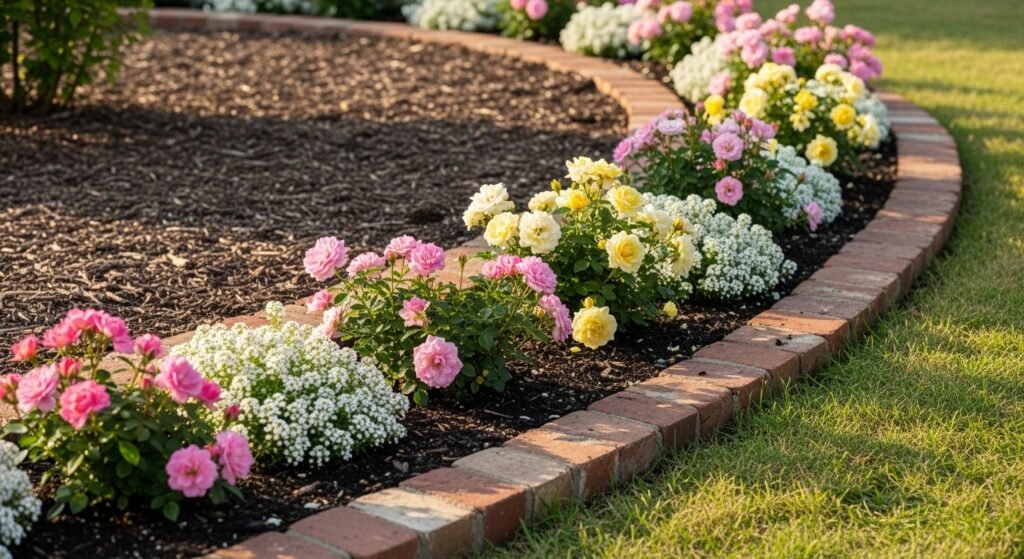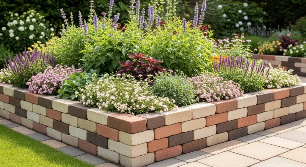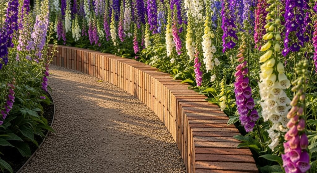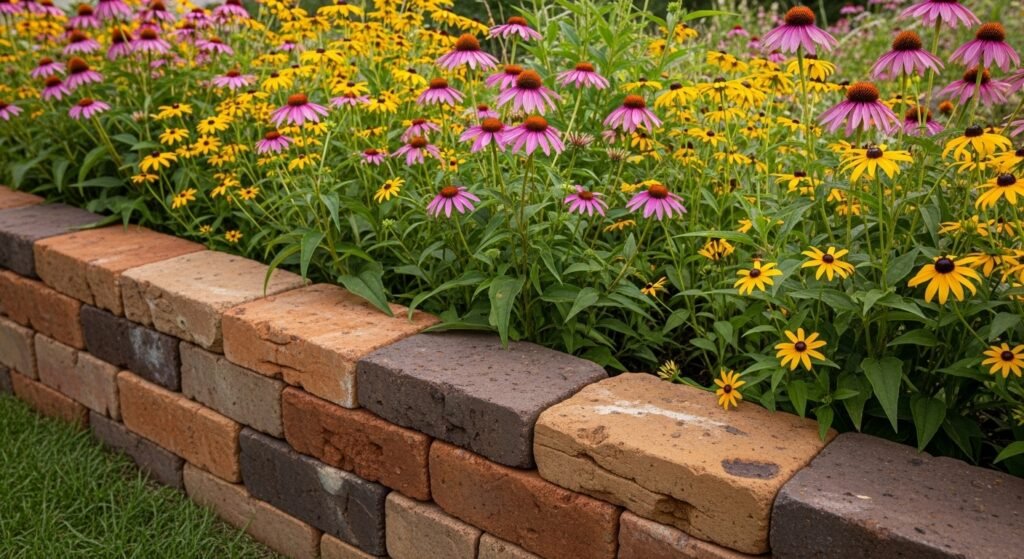 Using bricks of different tones on purpose gives your border a custom, designer feel. This is a wonderful choice for gardens where color harmony matters—especially if you want your border to complement your home’s exterior.
