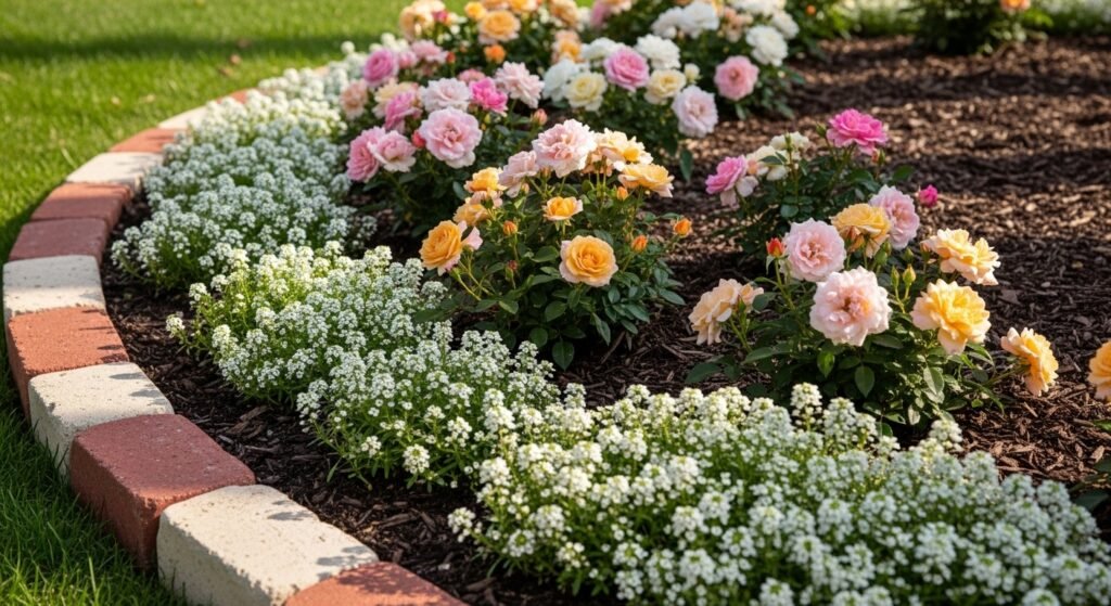If your flower bed needs a little height, stacking bricks in two layers adds structure without overwhelming the space. This border serves as a gentle retaining wall—great for raised gardens or areas with gravel paths. It looks especially beautiful around roses, hydrangeas, and larger shrubs.