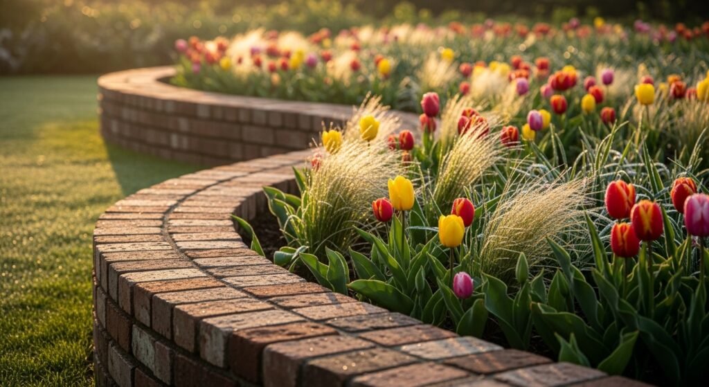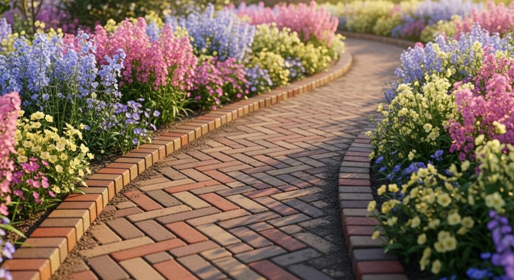 Curved brick borders soften your garden’s lines and create a gentle, welcoming flow. This style is perfect for flower beds that wind naturally around trees, patios, or walkways. It feels graceful and intuitive—like the garden grew that way on its own.