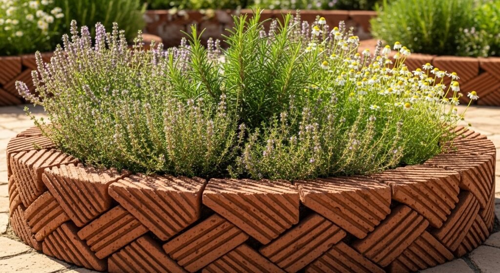 Basketweave gives your border playful texture. By alternating bricks in pairs—horizontal and vertical—you create a woven visual effect. It’s charming, whimsical, and perfect for gardens with herbs, lavender, chamomile, and other soft cottage-style plants.