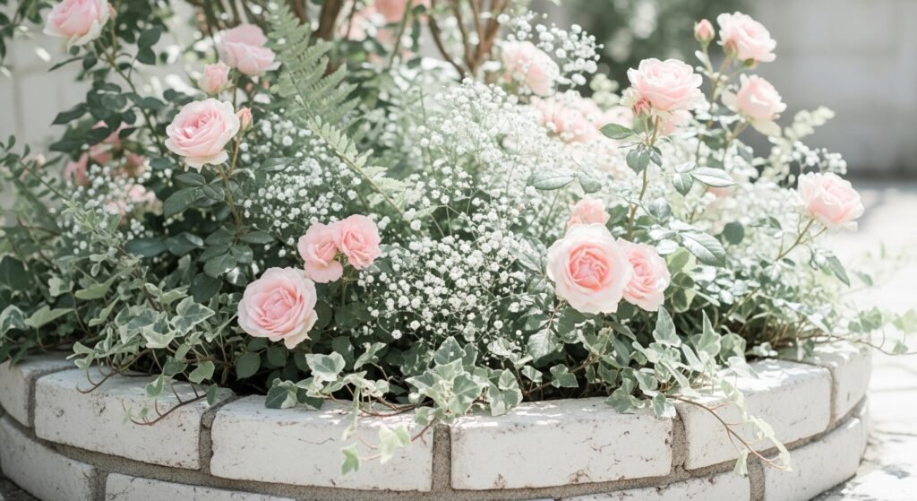 Whitewashing bricks softens their tone and adds a dreamy garden-storybook feel. This style brightens shaded areas and pairs beautifully with pastel flowers. It’s a lovely choice if you want your garden to feel feminine, airy, and serene.