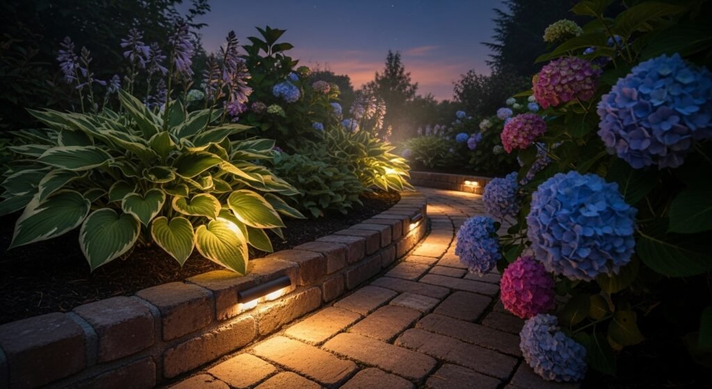 Small solar or low-voltage lights can be built right into the brick line, creating a soft glow at night. It’s incredibly atmospheric—your garden becomes a magical space after sunset, perfect for quiet evenings outdoors.