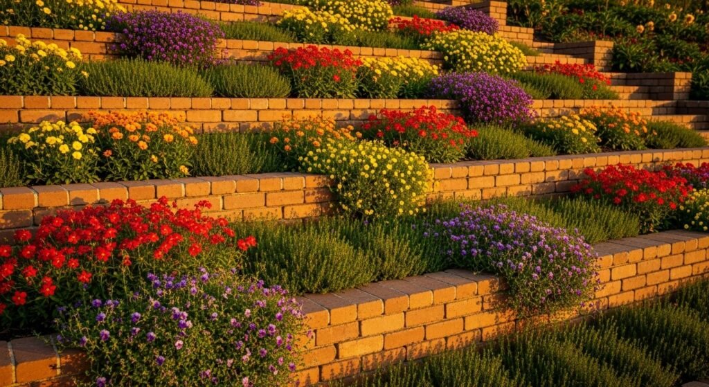 If your yard slopes, a terraced brick border helps hold soil in place while adding visual rhythm to the landscape. It turns uneven ground into beautiful layered planting beds that draw the eye upward.