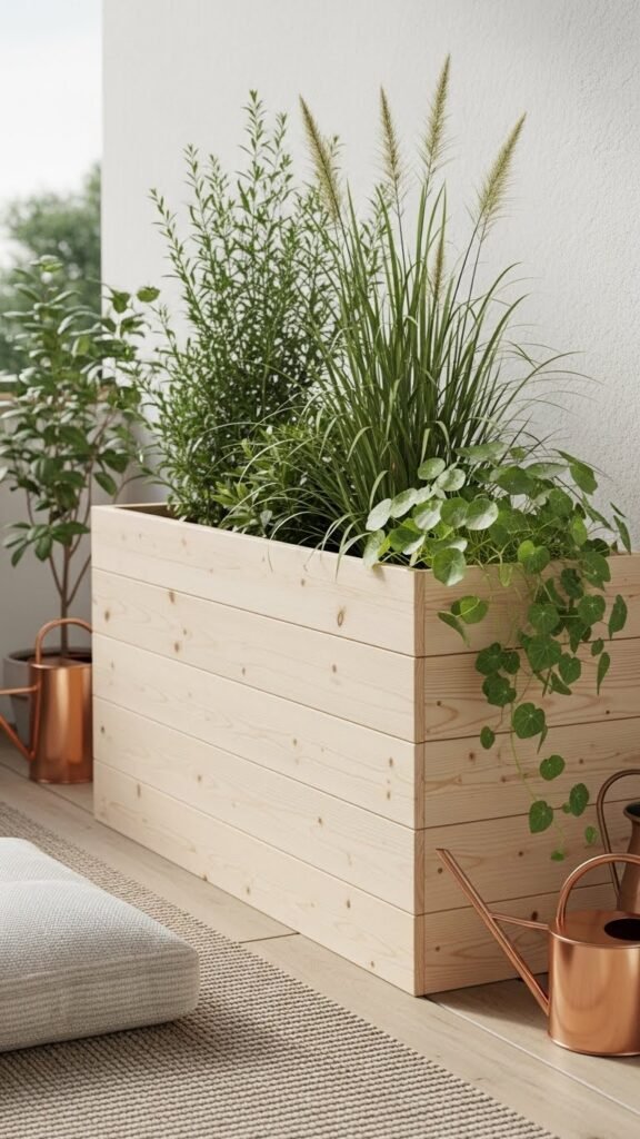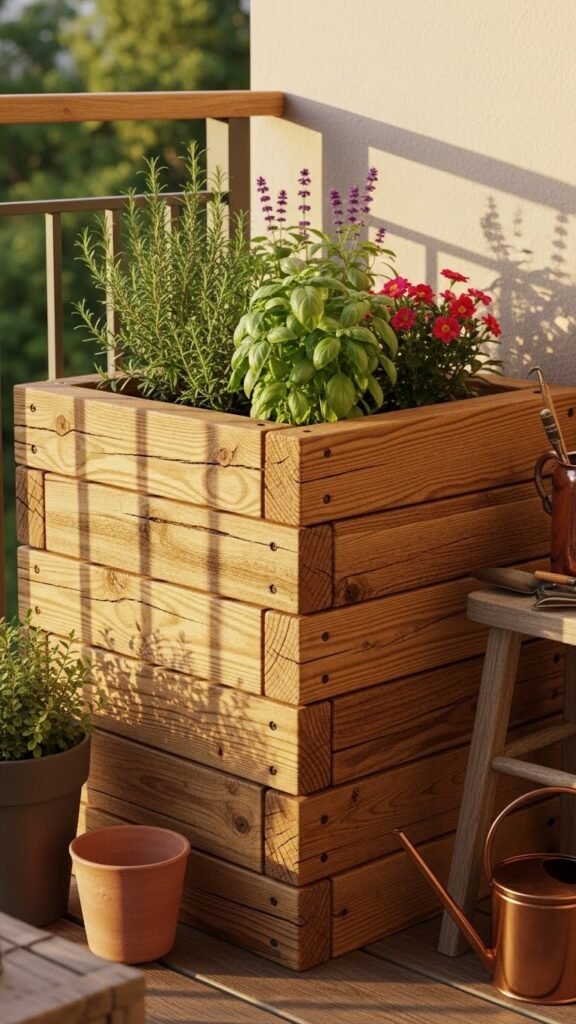 These planters use warm, slatted wood that feels polished and relaxed. Their long, narrow shape is perfect for balconies or terraces — giving you green privacy without crowding your space.