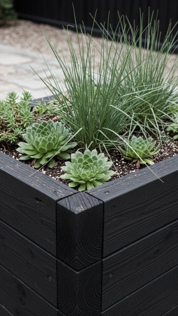 Style them with simple textures: a copper watering can, a couple of terracotta saucers, maybe a woven seat cushion nearby for relaxed potting sessions. At the back, plant taller greenery like rosemary or ornamental grasses, and in front, softer trailing plants like nasturtiums or sweet potato vine to soften edges. You can leave the wood natural to fade under the sun or go for a charcoal stain for contrast. Minimal effort — big impact.