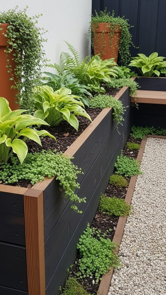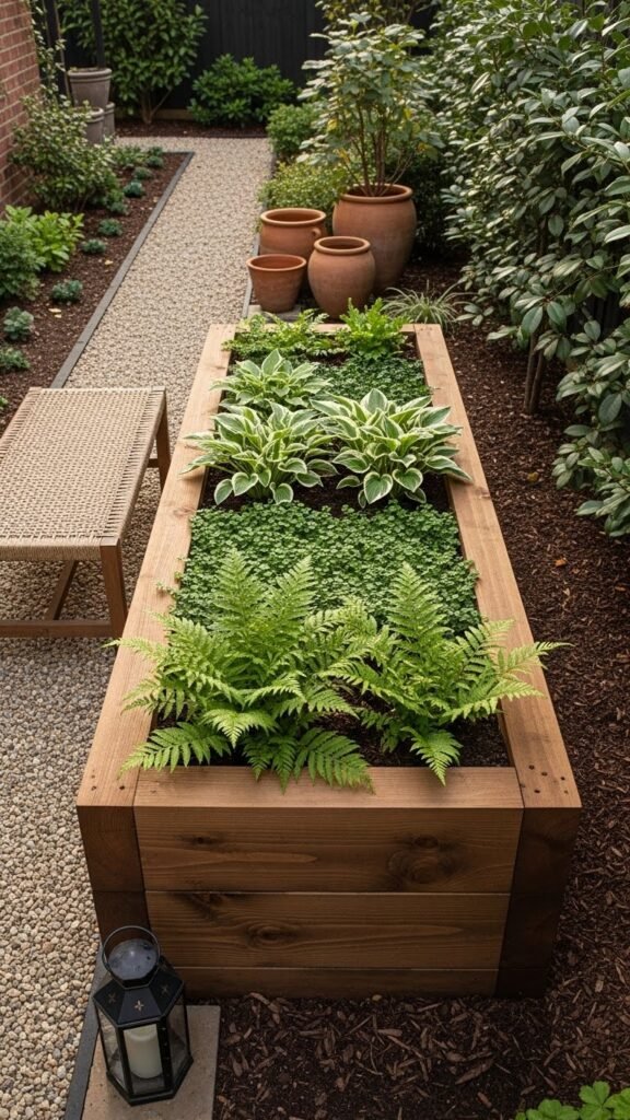 They accommodate shade-loving greenery beautifully: tall feathery ferns for drama, soft hostas for a sculptural touch, and groundcover spilling over the edge. The height gives instant privacy while still keeping things lush. Add weathered watering cans or clay pots for charm; a woven seat cushion or narrow bench can invite you to stay awhile. String soft globe lights or tuck in lanterns for evening atmosphere. A trailing vine or variegated leaf plant adds dimension — and letting things lean a bit wild is the point.