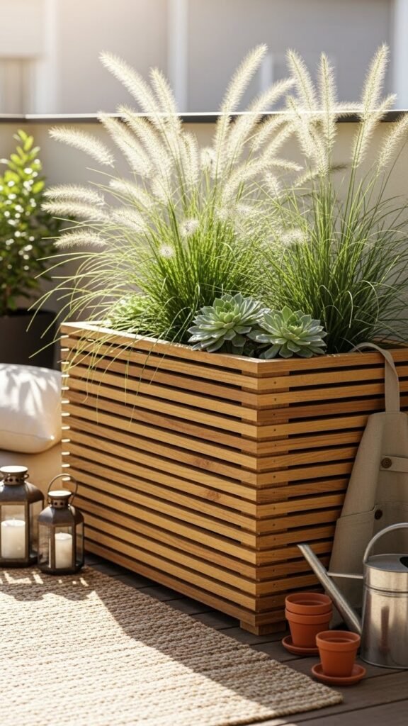 I love filling them with airy fountain grasses catching the light, wispy seed heads for vertical interest, and small rosette succulents for contrast. Simple styling — perhaps a woven rug and a couple of lanterns for soft evening ambiance, or stacking two at different heights to add structure. A gravel mulch, a few small terracotta herb pots, a metal watering can and a folded canvas apron nearby round out the look. Pair with pale-wood seating or wicker chairs and let the grasses do the breezy work — you’ll look effortlessly relaxed.