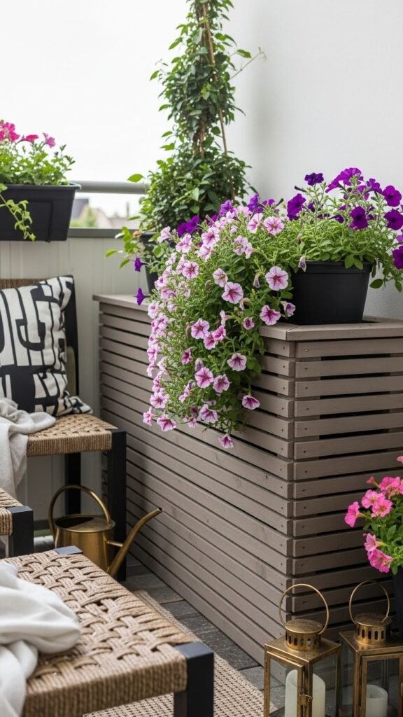These boxes combine a relaxed, slightly refined vibe. Clean rectangular lines give structure, while cheerful petunias spill over, adding life and movement — all without much effort.