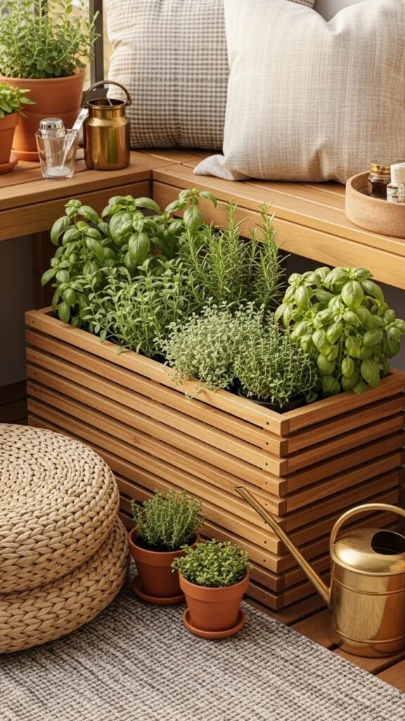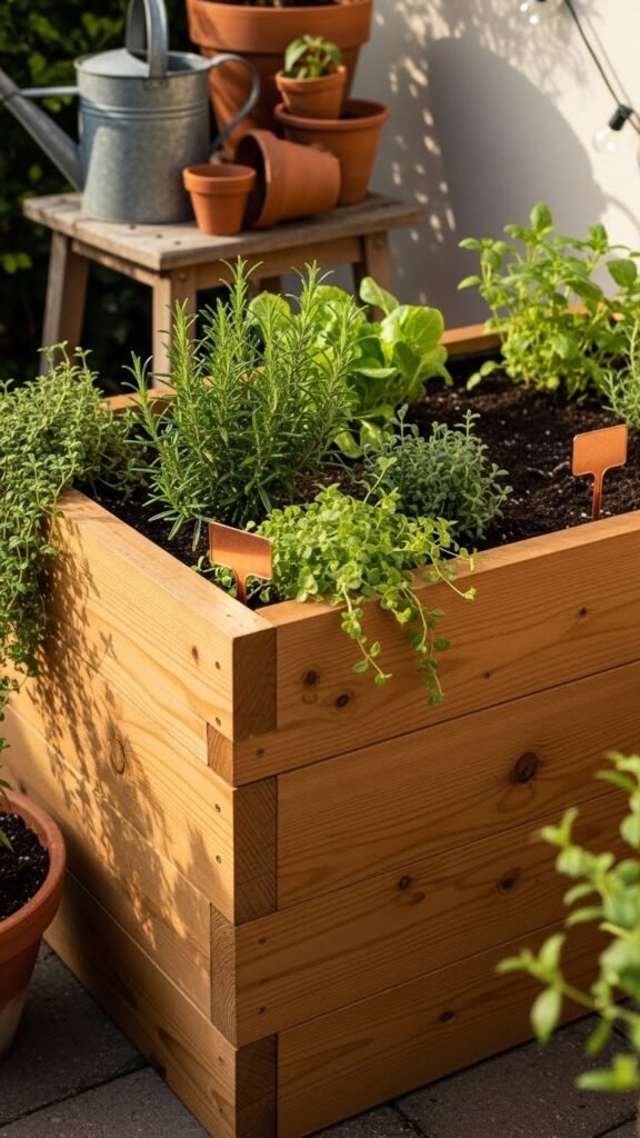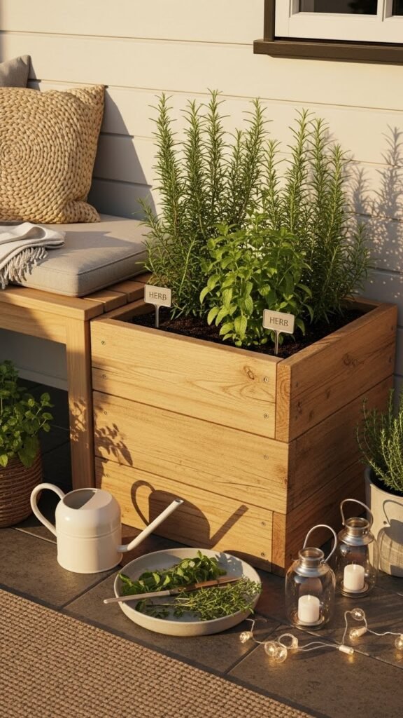 It’s filled with upright rosemary, soft mints, and kitchen herbs spilling slightly over the edge — perfect for grabbing fresh herbs on mealtime whim. Style simply: a few terracotta pots with trailing herbs, a woven cushion, and a small ceramic watering can nearby. Add metal herb labels, a shallow basket for clipping harvests, and string lights or lanterns — and suddenly it’s a spot you actually want to hang out in after sunset.