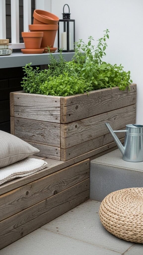 Plant with an easy mix of herbs and leafy fillers — forgiving if you miss a watering now and then. Style simply: terracotta pots, a rumpled woven cushion, a slim watering can left casually nearby, and lanterns for evening glow. Group several boxes to create rhythm and charm, building curb appeal without effort.