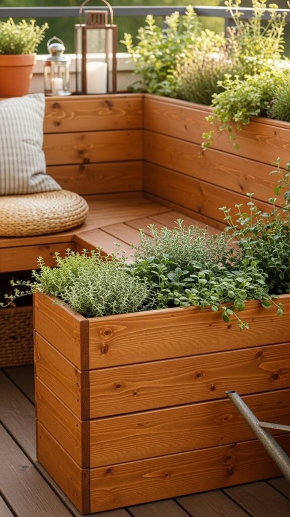 With slatted wood that complements nearby benches or decking, these planters feel like built-in furniture. They’re ideal for kitchen herbs — basil, rosemary, soft feathery herbs — making it easy to snip fresh greens without ever leaving your seat.