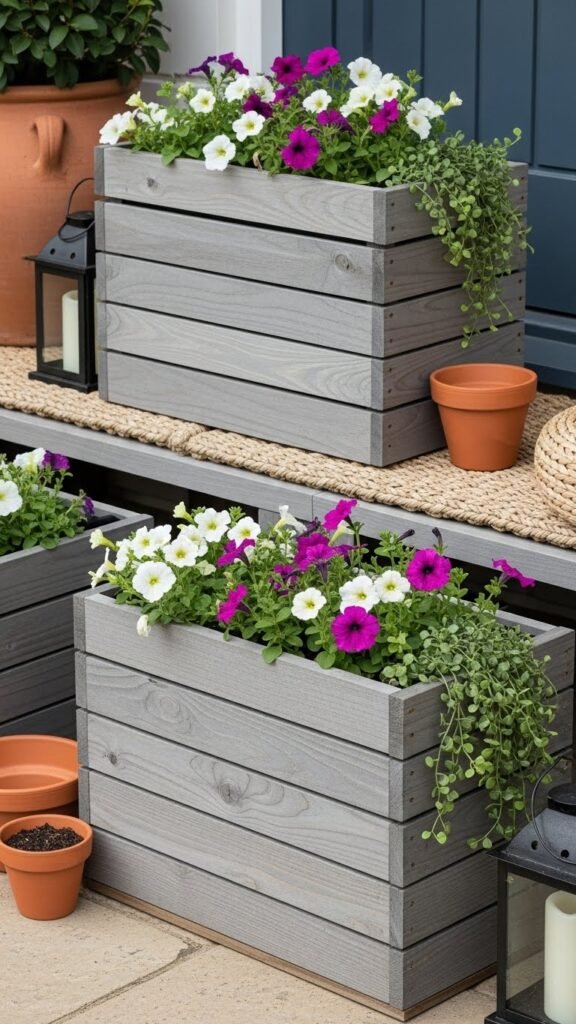 Plant with a mix of seasonal blooms and trailing greenery for energy and softness. Pair with terracotta pots and a woven seat pad for texture. Flank a door with two matching boxes for quick curb appeal. Finish with lanterns or string lights for nighttime mood. If you want more height, add a slim trellis or small bench — but often, the boxes themselves do all the work.