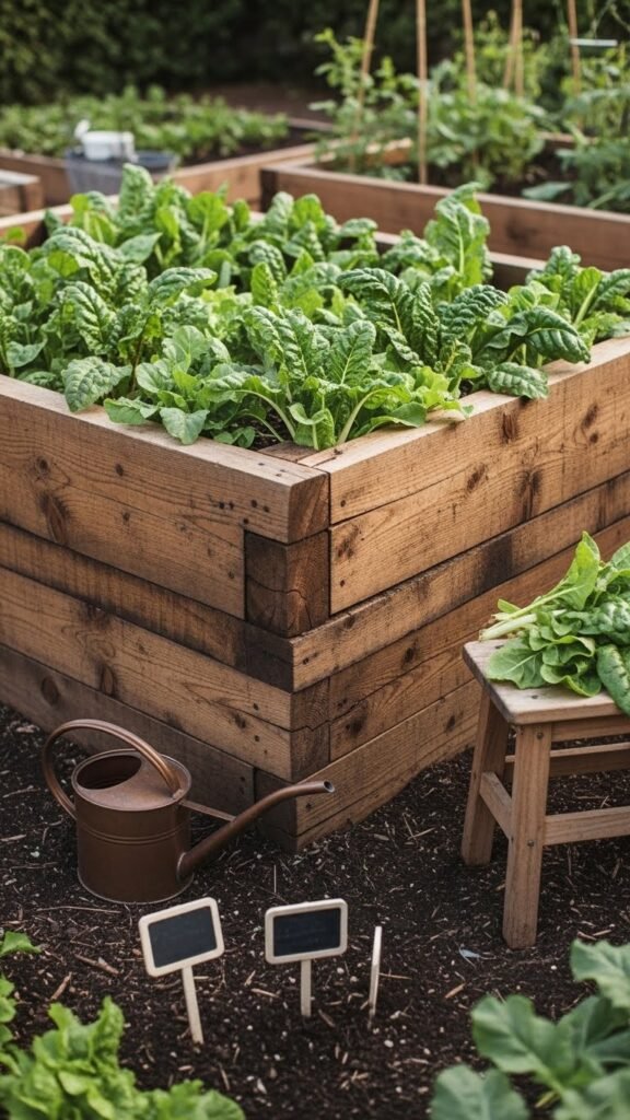 With deep, roomy beds, these are ideal for leafy greens, hearty vegetables — think big, healthy lettuces or chard. The wood grain and simple joinery feel honest and durable, and the dark soil beneath makes it look purpose-built, like a proper kitchen garden rather than a decorative afterthought.