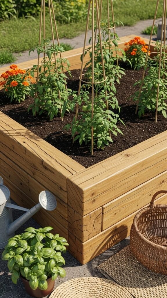 Plant tomatoes with simple bamboo stakes for support. Tuck in companion plants like basil or marigolds in the corners for color and pest control. Leave a rustic watering can and a harvest basket nearby for a lived-in feel. Add terracotta pots or a woven mat at the base, string solar lights, or add a wooden stool — it becomes a warm, functional, cozy garden spot.