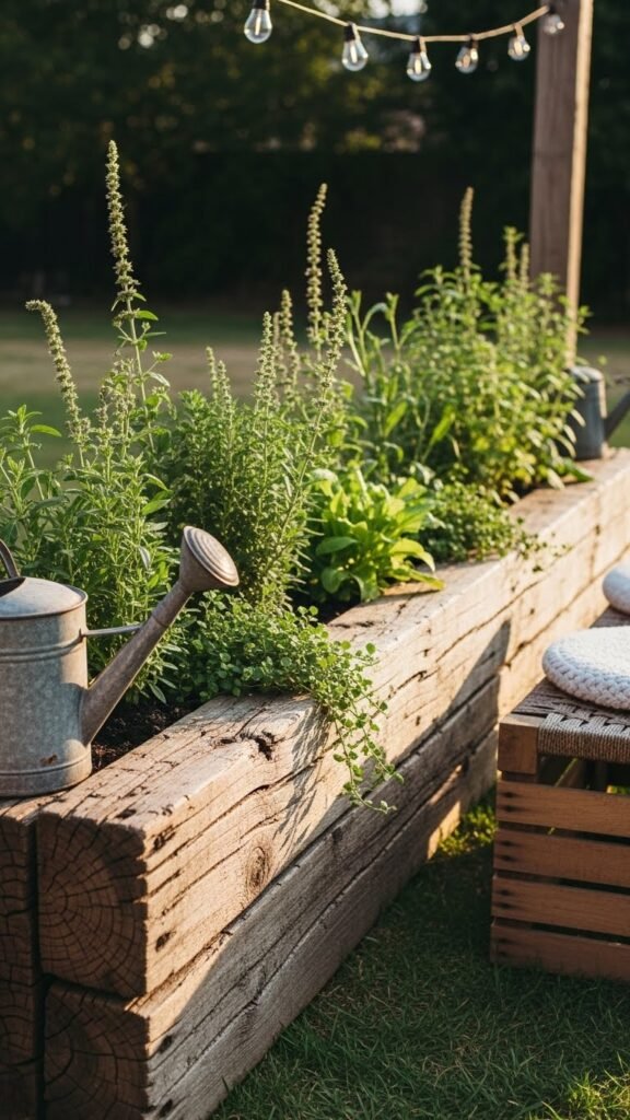 Fill with a mix of upright herbs, leafy greens, and a few trailing plants for softness. Keep metal fastenings minimal and let the soil show you mean business. Style simply: terracotta pots or a chipped watering can at the ends, a low bench or woven crate for seating, and soft string lights for the evening. Toss in a bold architectural plant spilling over one side — that’s enough flair.