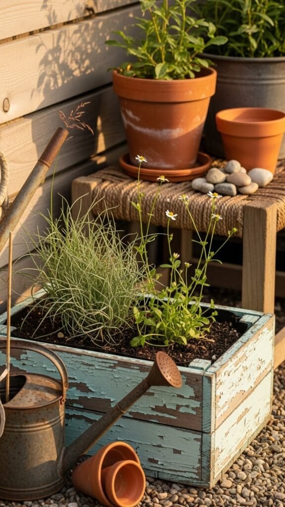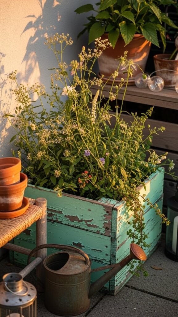 There’s enough depth for hardy perennials, a few volunteer annuals, maybe some herbs or bold foliage plants. Style it simply: a rusted watering can, mismatched terracotta pots, a woven stool for sitting nearby. Add soft string lights or a lantern for evening mood. Keep the palette warm wood, weathered textures, natural greens and minty paint tones. Let things lean imperfect — that scruffy edge brings charm.