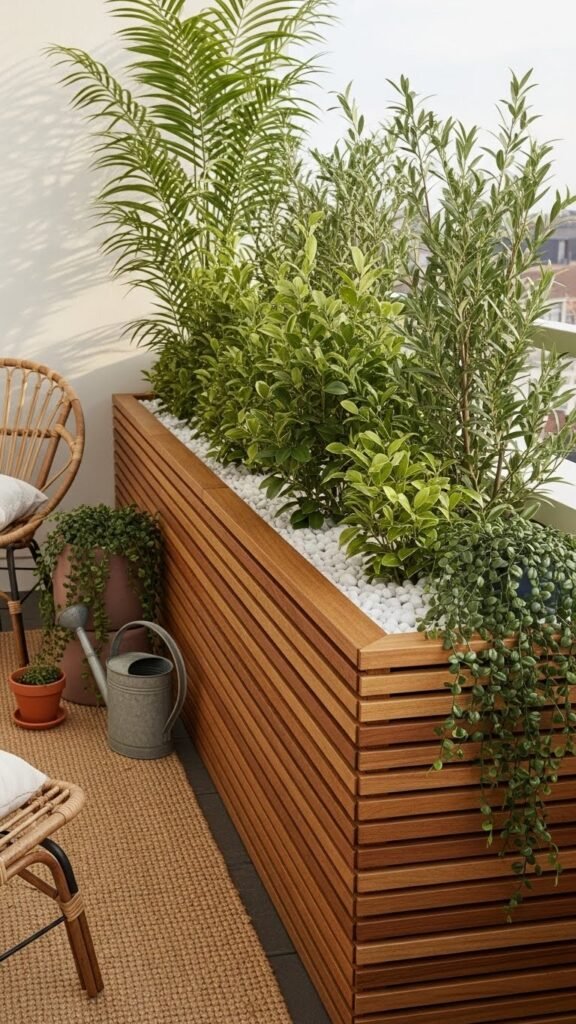 Fill with a blend of taller palms and glossy shrubs for height and movement, top with crisp white pebbles for a tidy finish. Style with a woven outdoor rug, a pair of rattan chairs, and a few terracotta pots with trailing plants at the ends. Lanterns or string lights deliver soft evening ambiance; toss in a weathered watering can for personality. It’s a planter that instantly transforms a balcony into a little outdoor room — relaxed, inviting, and intentional.