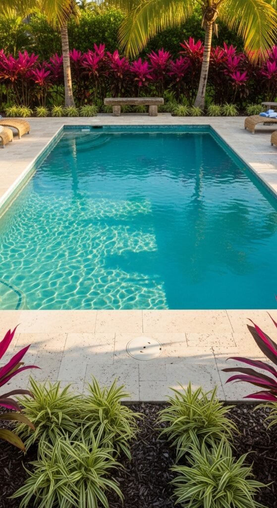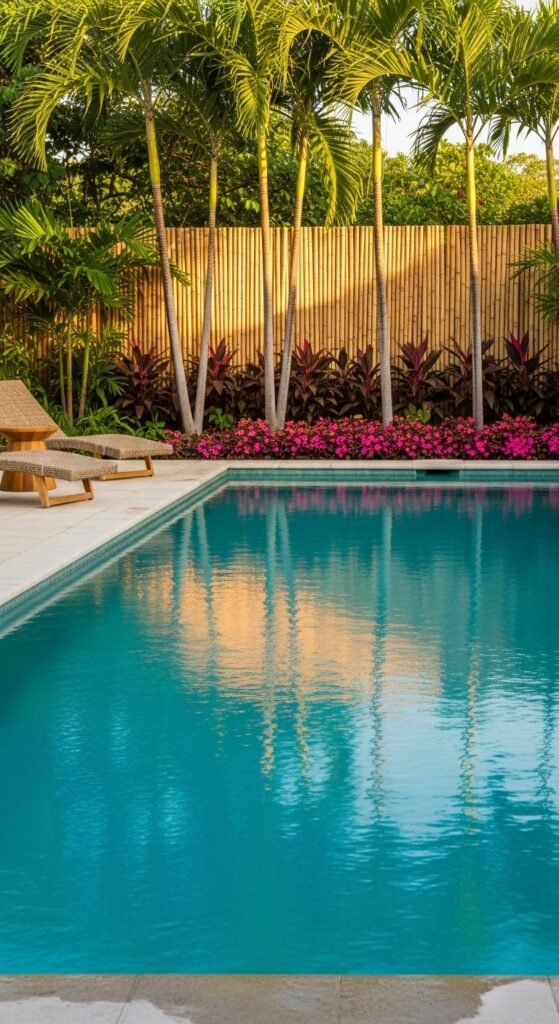 Tall, slim palms and a bamboo privacy screen set a soft canopy. Broad-leaf plants and bright magenta groundcovers brush up to the water’s edge. With stone coping and clean concrete paths, the look stays modern and fresh. Add woven loungers, a teak side table, and scatter potted ferns or citrus for a splash of life. Soft lighting, a couple of water-friendly pillows, and a low-key drink setup finish the scene.