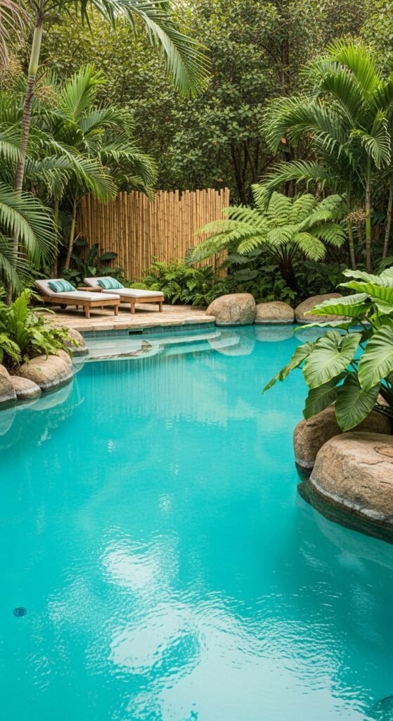 Turquoise water nestled among natural boulders, layered palms, lush ferns, and broad-leaf plants — this feels more like a jungle oasis than a backyard pool. A bamboo screen adds privacy and texture, and small cascades bring in a sense of motion and sound. Low loungers, terracotta pots with bromeliads or philodendron, citronella torches, and a pebbled or slate path connect the entire area with subtle intention.