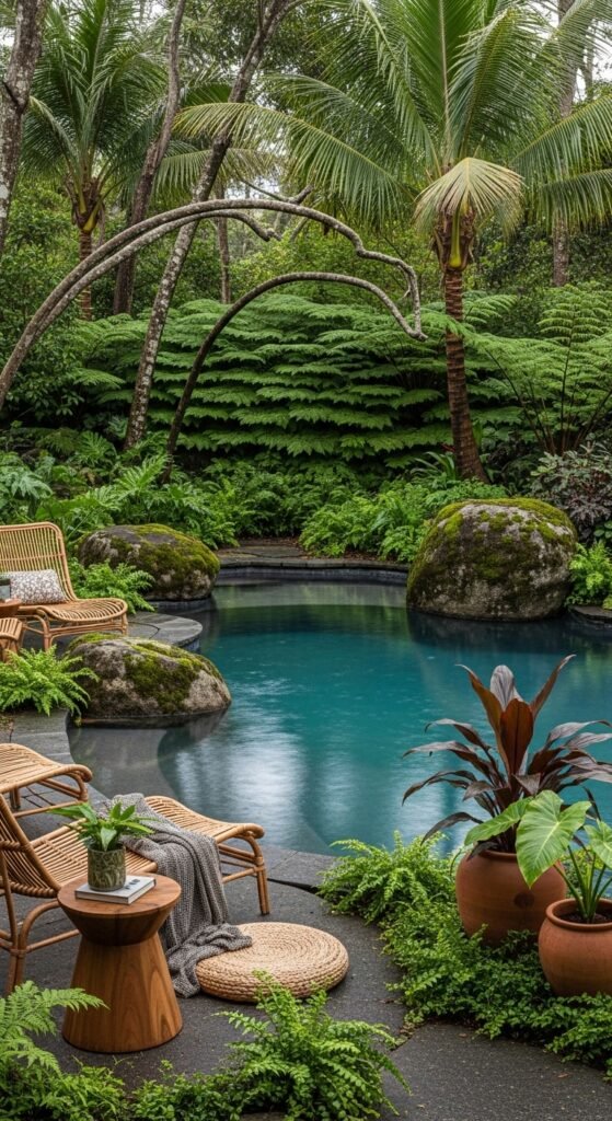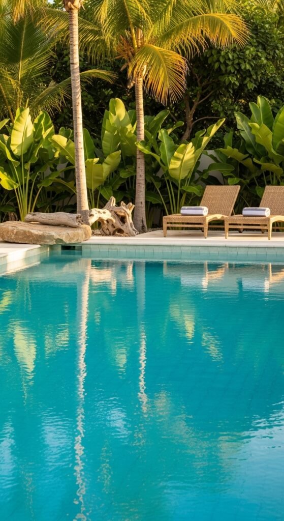 Oversized glossy leaves create drama, while tall palms frame the sky and add vertical interest. Natural stone edging blends the pool into the landscape; a slab rock ledge or driftwood detail adds authenticity. Furnish sparsely — woven loungers, linen towels, rattan side tables — and add soft uplighting or lanterns for evenings. A few ceramic pots with bold foliage keep things balanced.