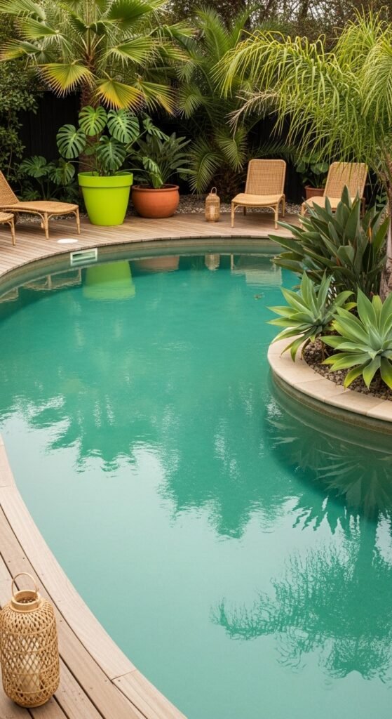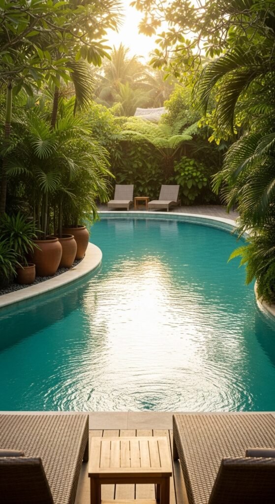 A curved pool tucked into lush palms and glossy leaves, softened by ferns and grassy plants, offers pure serenity. Terracotta pots add earthiness and help the greenery pop. Simple furnishings — woven loungers, a teak side table, soft cushions — plus lanterns or string lights for dusk, layered pots for depth, and natural textures make this a dream pool hideout.
