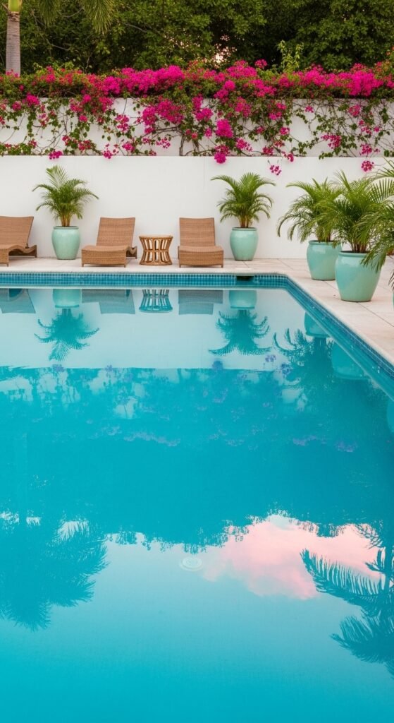 Hot-pink bougainvillea cascades over a white wall, while a neat row of weathered pale pots holds feathery palms. Turquoise water reflects the greenery and petals for a dreamy edge. Add woven loungers, a rattan side table, striped towels — keep it simple to let the plants shine.