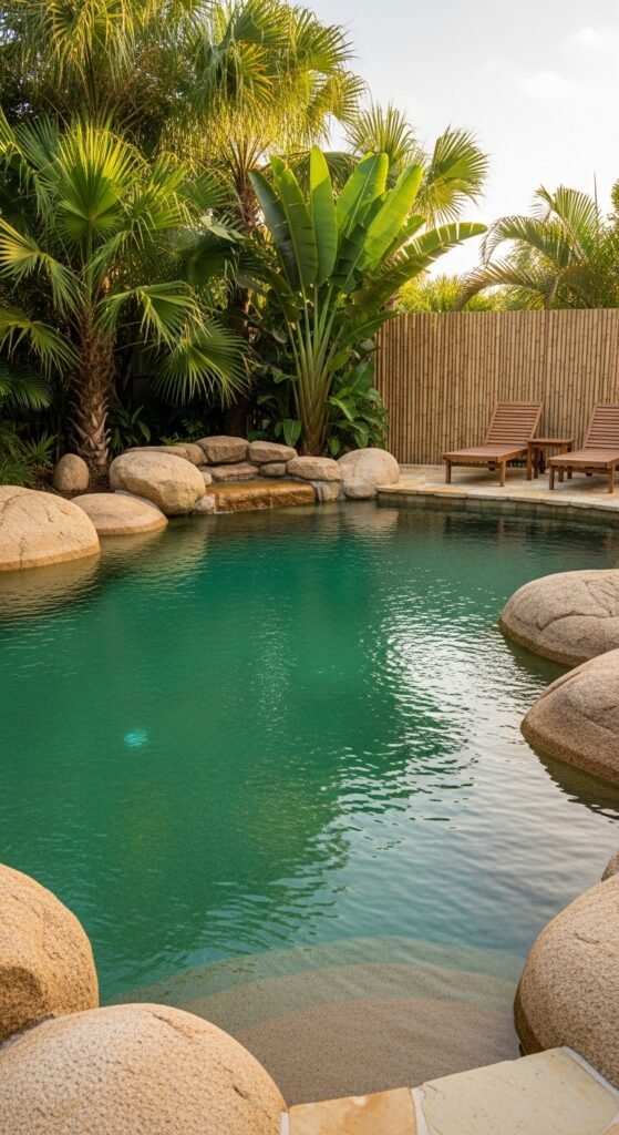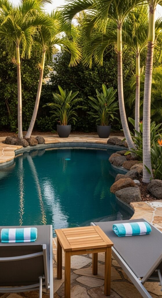 Imagine deep blue-green water edged by natural stone and lava rocks, with palms rising around it. The result? A cozy, luxe tropical vibe. Add some weatherproof loungers, a teak side table, and bright linen towels for the full island effect. Layer in some potted palms or bird-of-paradise plants, lanterns for evening glow, and a woven rug to complete the mood.