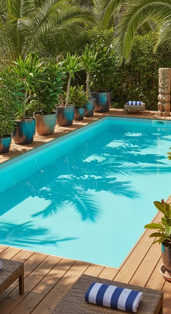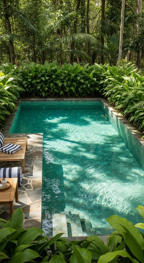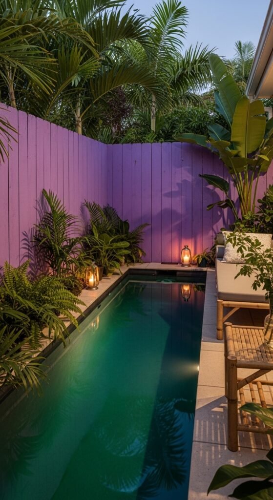 This narrow plunge pool feels like a hidden tropical corner. Palms, ferns, and large-leaf plants give immediate privacy. A purple fence adds bold personality, the turquoise water pops against it. Compact loungers or a cozy daybed, bamboo side table, string lights or lanterns, and a few extra potted plants make the space feel like an intimate retreat.