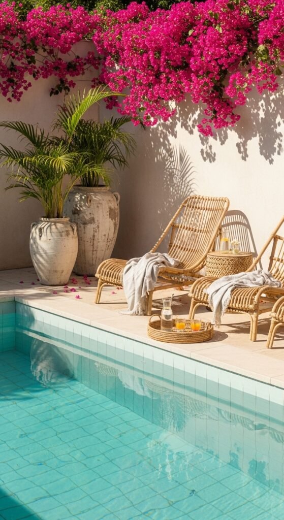 Bright bougainvillea cascading over a low wall instantly transforms the pool into a cozy hideaway. Feathery palms in weathered ceramic pots introduce vertical interest, and the pale turquoise tiles keep the mood relaxed. Rattan loungers, linen throws, and a woven drink tray set the evening scene for easy, breezy vibes.