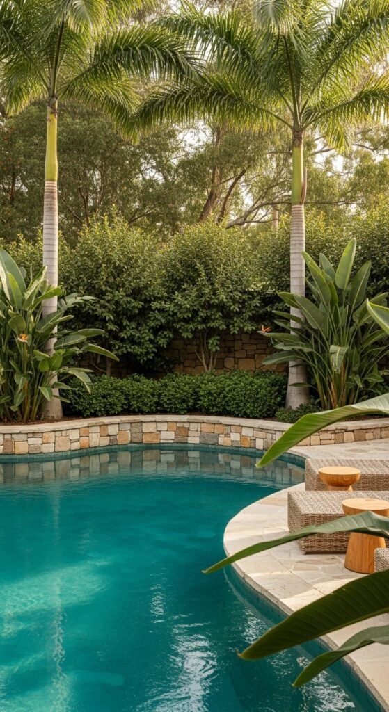 Tall palms and bird-of-paradise frame the pool, layered mainly by shrubs and clumping foliage for privacy. Curved stone coping and a low wall keep things natural and slightly wild. Add woven loungers, teak side tables, striped towels, let a few leaves overhang the water for that relaxed, informal island look.