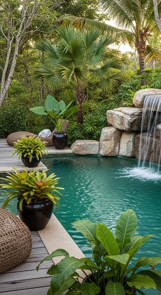 Here, big palms and fan-like leaves create a leafy canopy, while strappy bromeliads and lush planters soften a wooden deck’s edges. A rock waterfall adds a tranquil soundtrack and makes the water shimmer turquoise. Furnish with woven loungers, terracotta or dark ceramic pots for contrast, lanterns or string lights, and maybe a bird-of-paradise or citrus pot for scent and extra greenery.