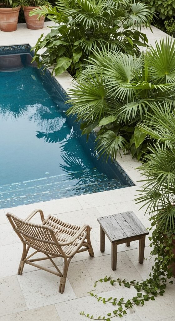 The pool’s waterline is trimmed with mosaic tiles and surrounded by pale travertine pavers, elegant, but still natural. Broad-leaf plants and palms press up close to the water, their reflections doubling the greenery. A striped rattan chair, weathered wood side table, and terracotta planters filled with palms or trailing vines complete the laid-back, rainforest-meets-pool vibe.