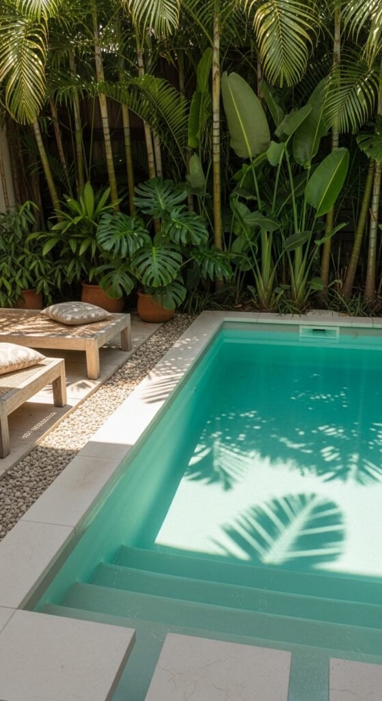 Layered palms, broad-leaf plants, and a natural stone edge combine to create a lagoon-like feel. Dappled sunlight dancing on the water makes it inviting, while a mix of glossy foliage and subtle blooms keeps things lush but not overbearing. A rattan lounger, striped towels, and a low teak table complete a minimalist yet comfortable setup.