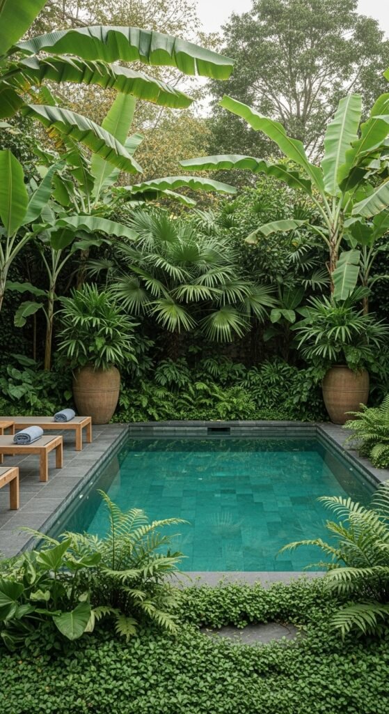 A dense mix of banana leaves, palms, and glossy undergrowth frames an infinity-style pool whose green water mirrors the trees. Raw stone coping and a narrow concrete edge keep things modern yet natural. Teak loungers, woven mats, large pots with bold foliage, lanterns, or even a hammock or daybed make it feel like a luxurious hotel hideaway.