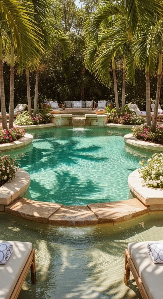 Tall palms and layered foliage create privacy and depth, while sandy edges and a natural stone waterfall give the water that hidden lagoon feel. Bright blooms in pink and white offset the green, sunlight filtering through leaves bathes the space in warmth. Paired-back furnishings — rattan loungers, crisp towels, patterned cushions — keep the focus on nature’s show.