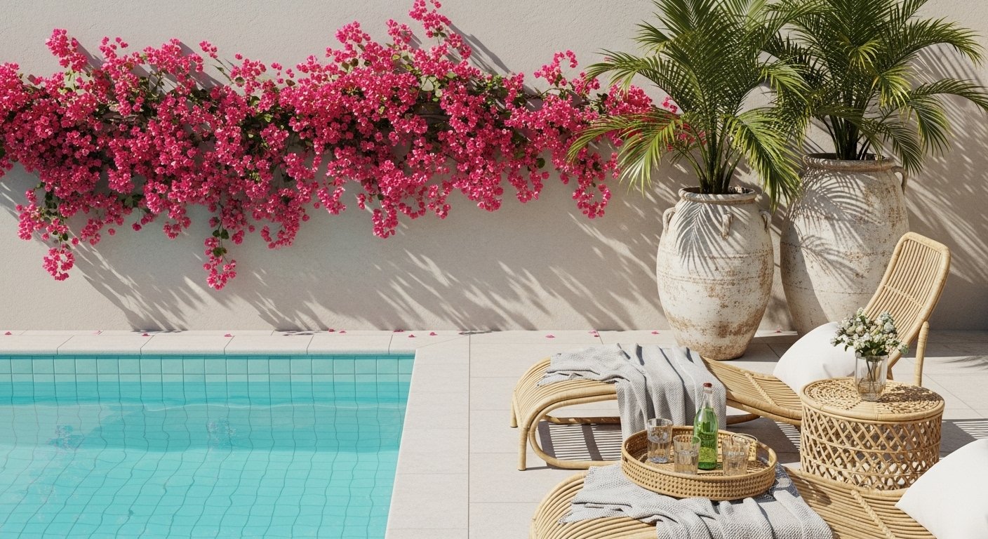 Bright bougainvillea cascading over a low wall instantly transforms the pool into a cozy hideaway. Feathery palms in weathered ceramic pots introduce vertical interest, and the pale turquoise tiles keep the mood relaxed. Rattan loungers, linen throws, and a woven drink tray set the evening scene for easy, breezy vibes.