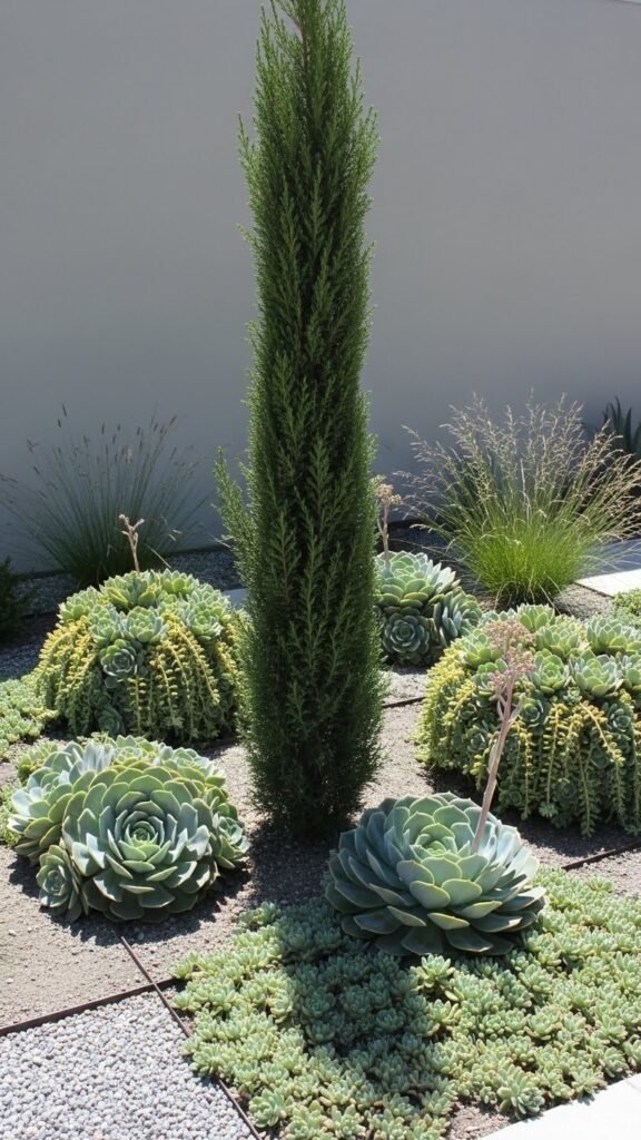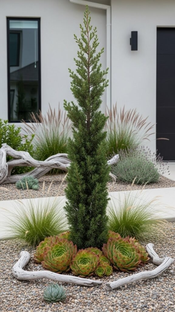 Pair a cypress tree with succulents and ornamental grasses for a clean, contemporary garden look. Adding natural elements like driftwood brings texture and character while keeping maintenance low.