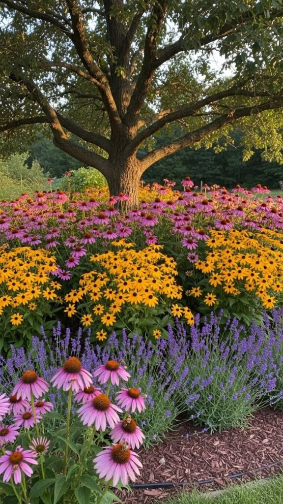 Surround your tree with bright perennials like coneflowers, lavender, and black-eyed Susans for a lively burst of color. These flowers come back each year and offer a mix of shapes and shades. By combining tall and low-growing plants, you can create a layered look that makes the tree feel like the centerpiece of a vibrant, blooming garden.