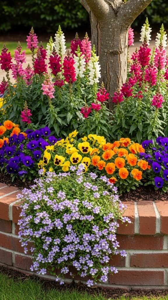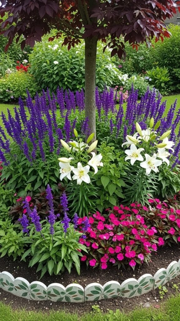Use flowers like salvia, lilies, and impatiens to create a colorful border around your tree. Mixing different heights and colors adds richness and drama. This works especially well if you want a vibrant, eye-catching garden centerpiece.