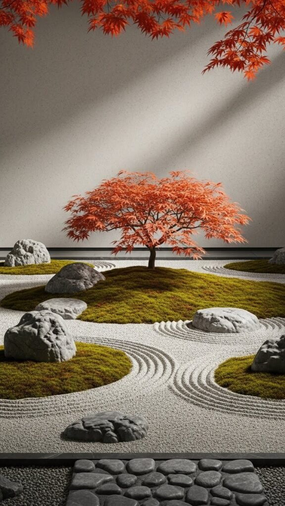 For a serene, Japanese-inspired garden, plant a Japanese maple and surround it with smooth river stones, moss, and gravel. The maple’s elegant leaves add color and movement, while the rocks and moss create a relaxing, low-maintenance landscape. This design is perfect if you love simplicity and calm aesthetics.