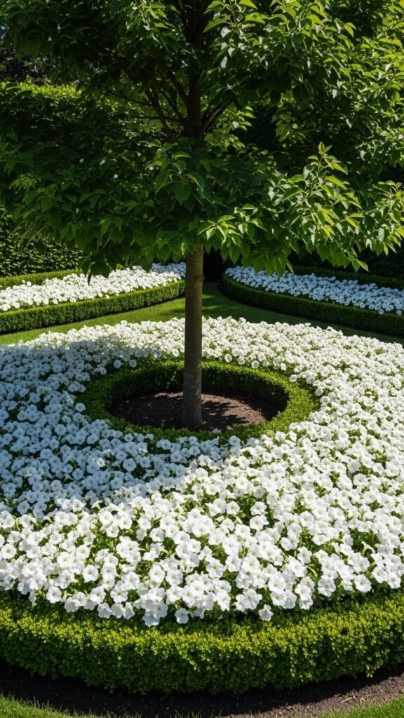 Create a round flower bed around the tree and fill it with white blooms like petunias or begonias. The bright white flowers contrast beautifully with the tree trunk and greenery, giving the area a clean, modern look. It’s simple yet highly elegant.