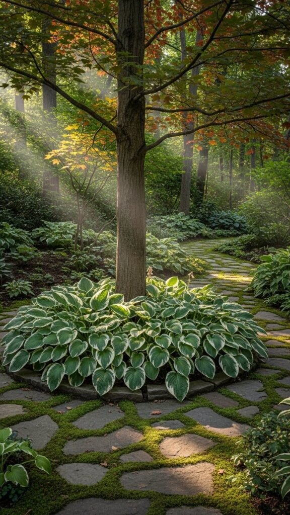 A tall maple tree becomes even more impressive when surrounded by groups of hostas in different colors. You can add stepping stones, moss patches, or natural rocks to enhance the woodland feeling, creating a shady garden corner that feels rich in texture.
