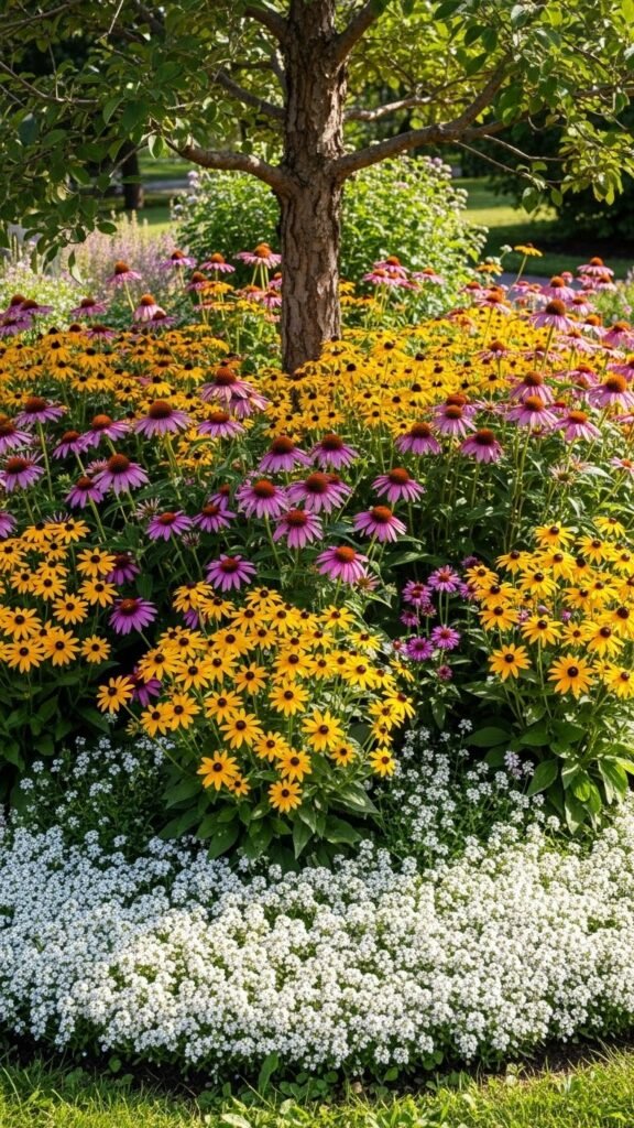 Using a ring of perennials like coneflowers and black-eyed Susans creates a colorful halo around your tree. Adding small groundcovers such as alyssum brings soft edges and helps fill gaps, making the whole arrangement feel full and lively.