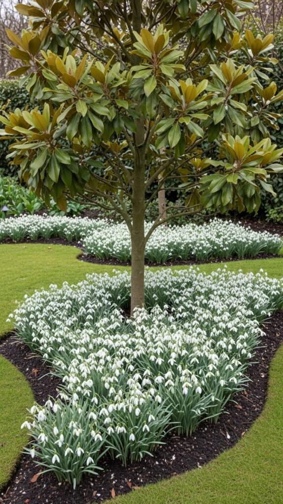 Pairing graceful magnolia trees with clusters of snowdrops at the base creates a soft, romantic look. A curved border makes the design feel natural and flowing, while the snowdrops give your garden a delicate springtime touch.