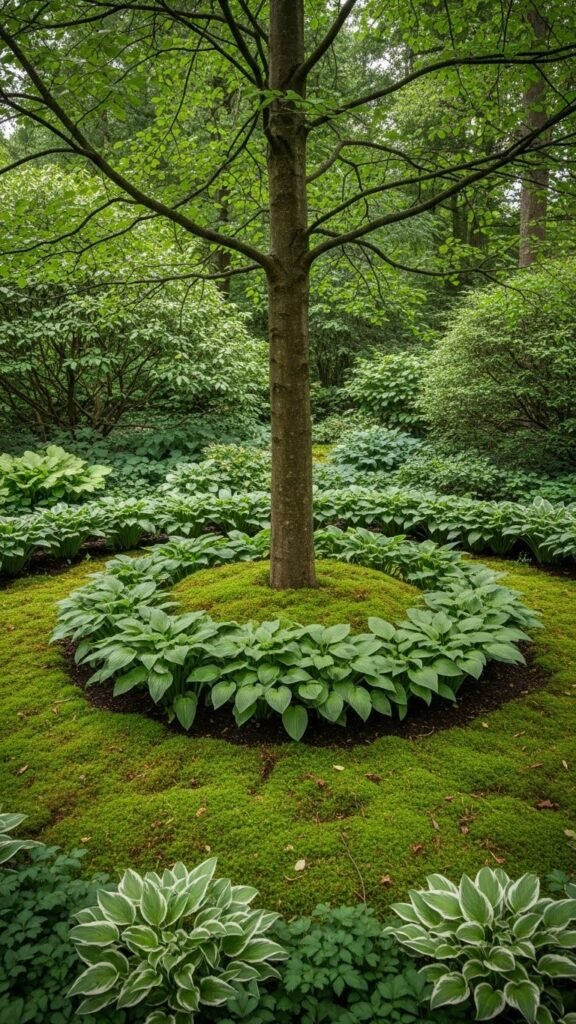 A circle filled with hostas and moss under a tree creates a calming, woodland-inspired space. The lush hostas bring big leaves while moss gives a soft carpet-like layer — together forming a peaceful green oasis perfect for shady gardens.