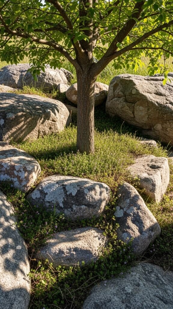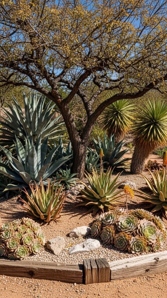 In dry climates, surround your tree with tough, drought-loving succulents like agave or aloe. Use sandy soil, gravel, and rustic wooden borders to complete the look. This creates a desert-style oasis that stays beautiful without much water or care.