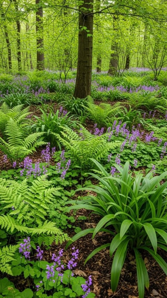 Mix ferns and violets under your tree for a charming forest-floor look. Ferns add height and texture, while violets bring spots of soft color. Organic mulch helps keep moisture in the soil and enhances the natural woodland feel.