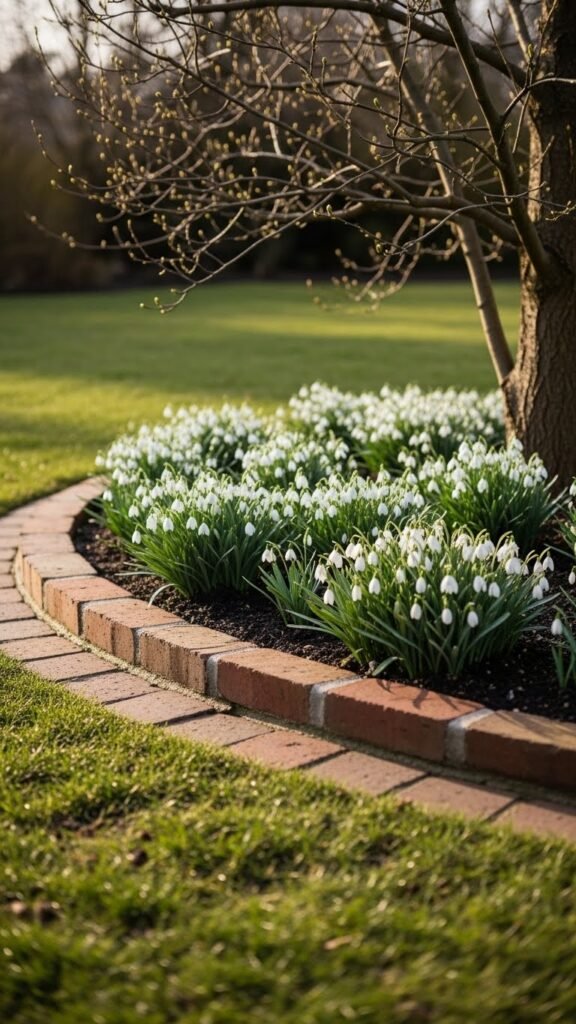 Outline your tree bed with curved bricks or stones to create a tidy, structured shape. Fill the inside with snowdrops or other early-spring flowers for a charming, elegant look that brightens your garden at the start of the season.