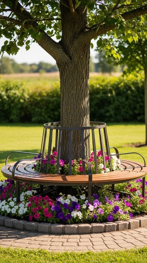Add a circular bench around your tree to create a cozy seating area. Surround the bench with colorful annuals or perennials, like petunias, to make the space even more inviting. It’s a great way to combine function and beauty.