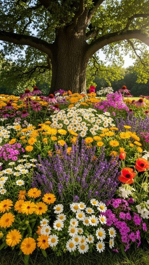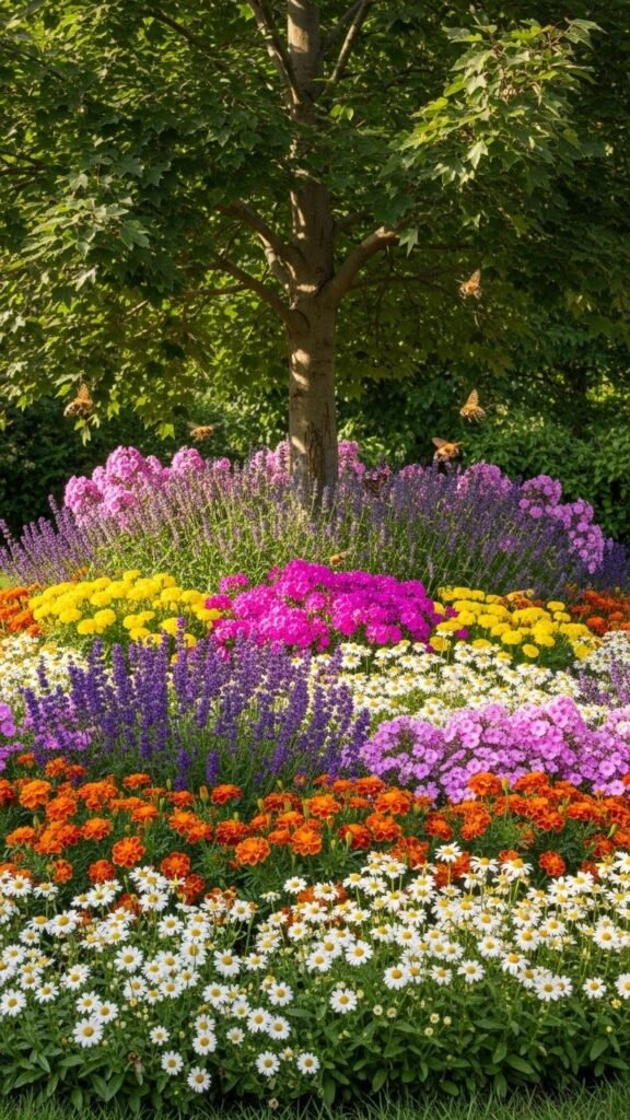 Create a dynamic, textured garden using clusters of marigolds, lavender, phlox, and daisies around your tree. Grouping flowers adds visual impact and makes the space feel cheerful and energetic. This design is full of color and movement.